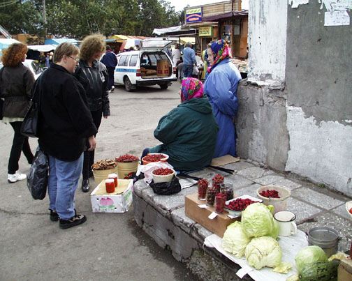 Market scene, produce from dacha and tundra